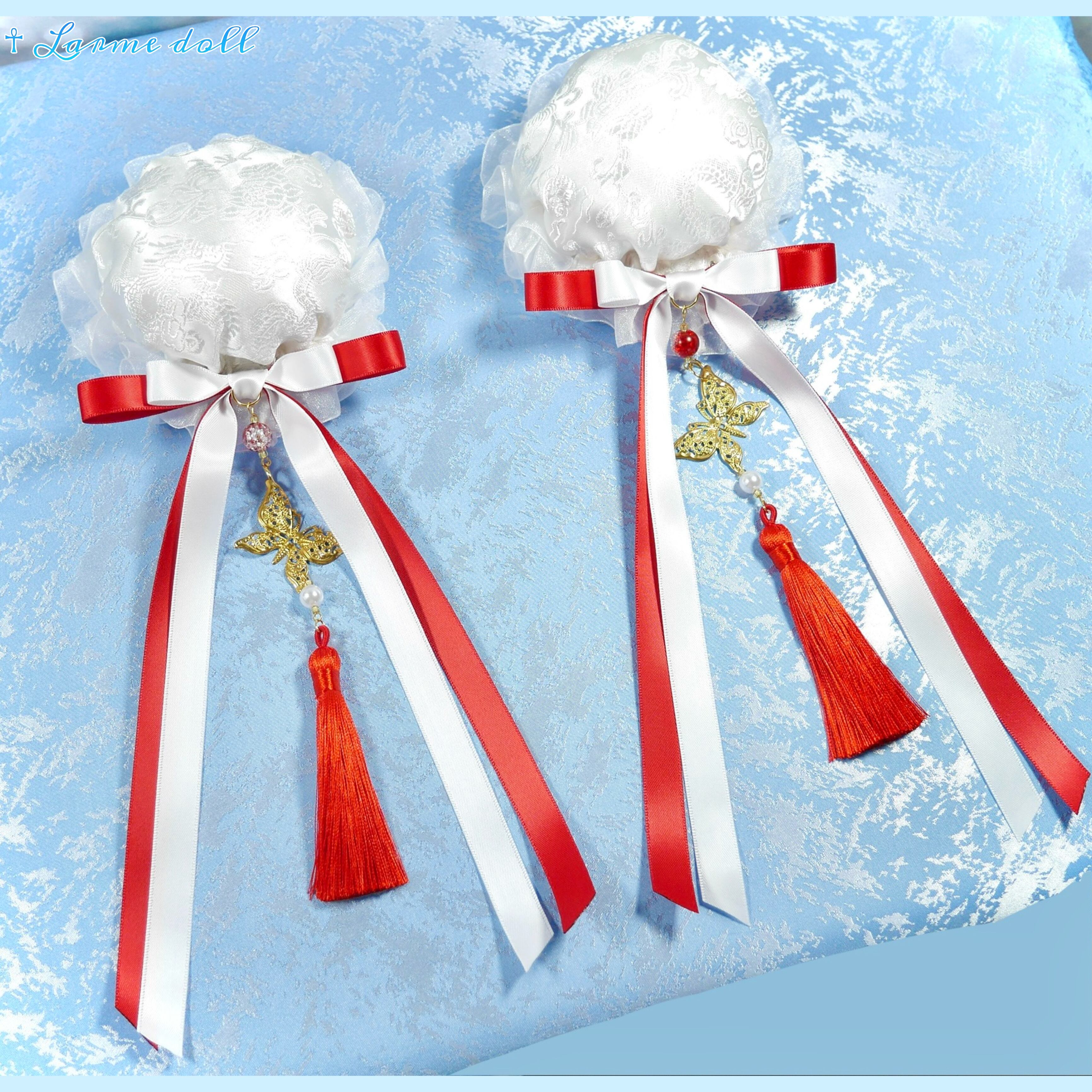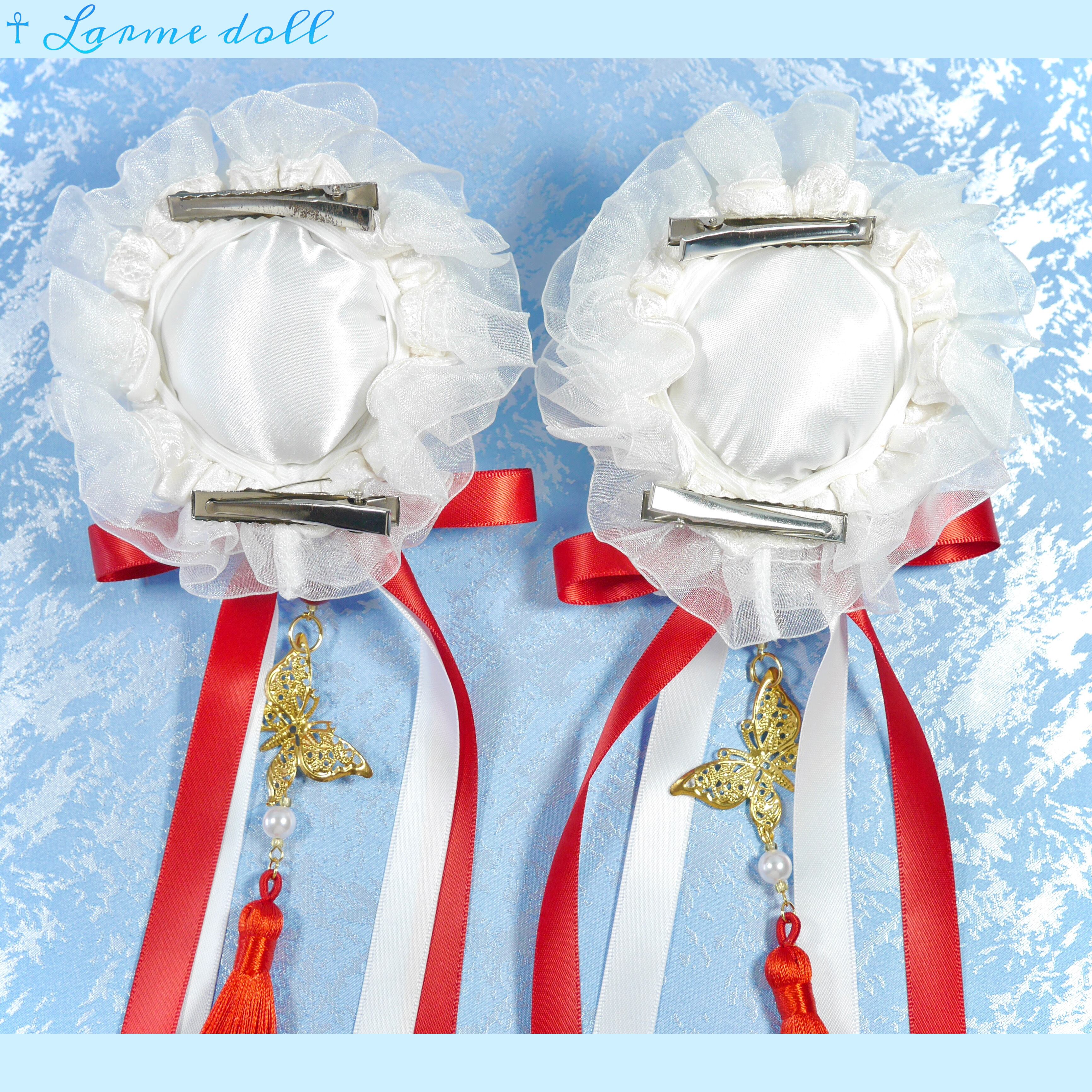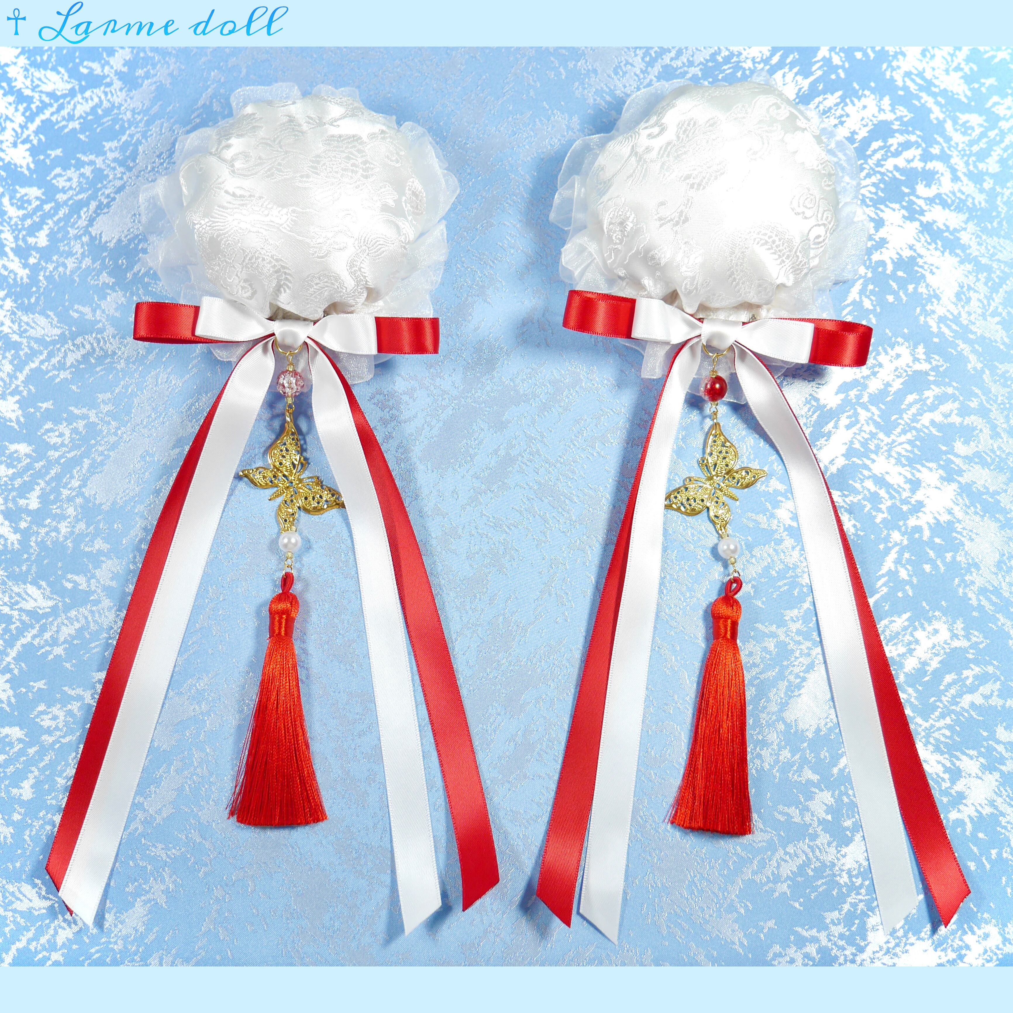 【受注生産】《☥》ダブルリボンタッセル付きお団子カバー カラー▷白×赤(接合パーツ、蝶チャームゴールドカラーver.)