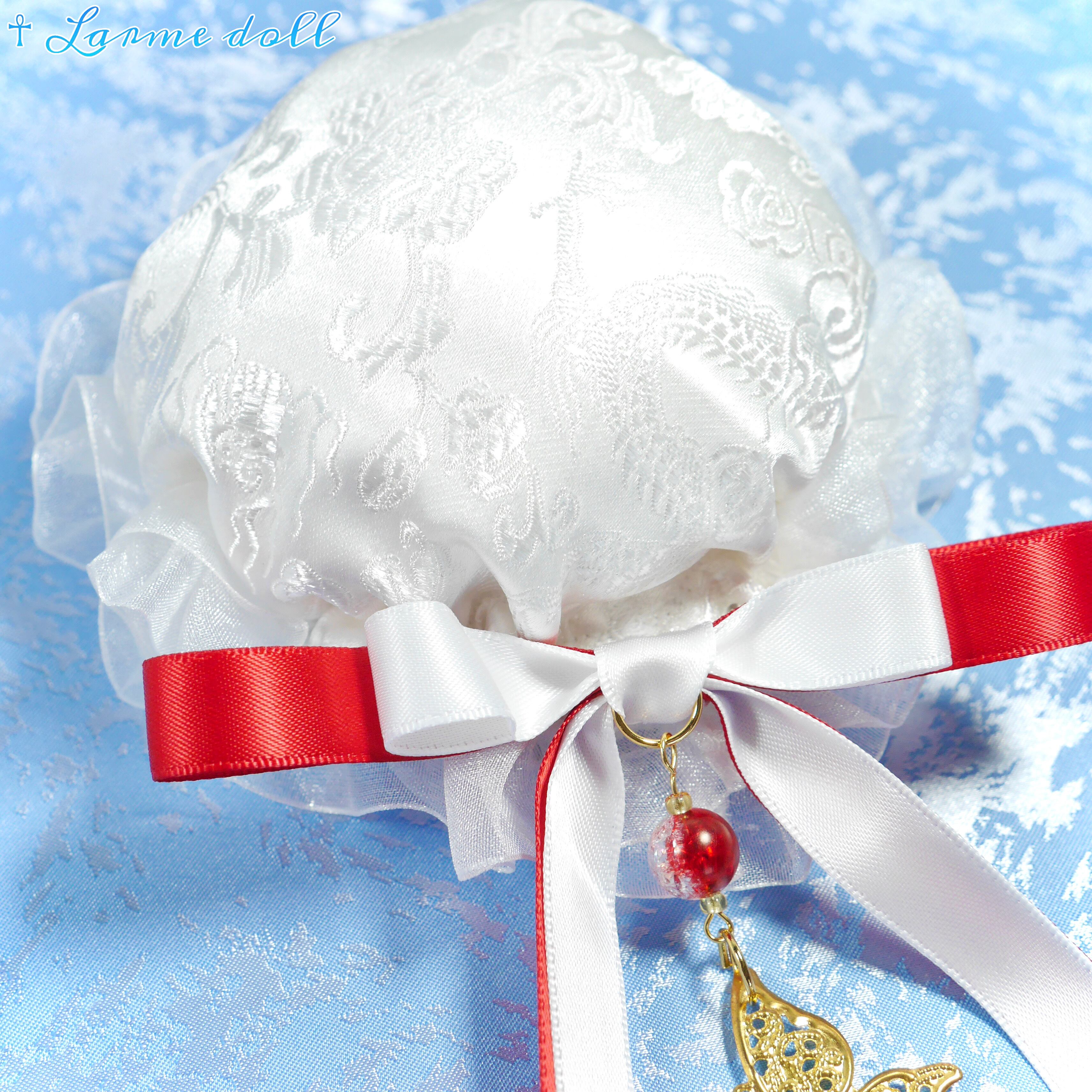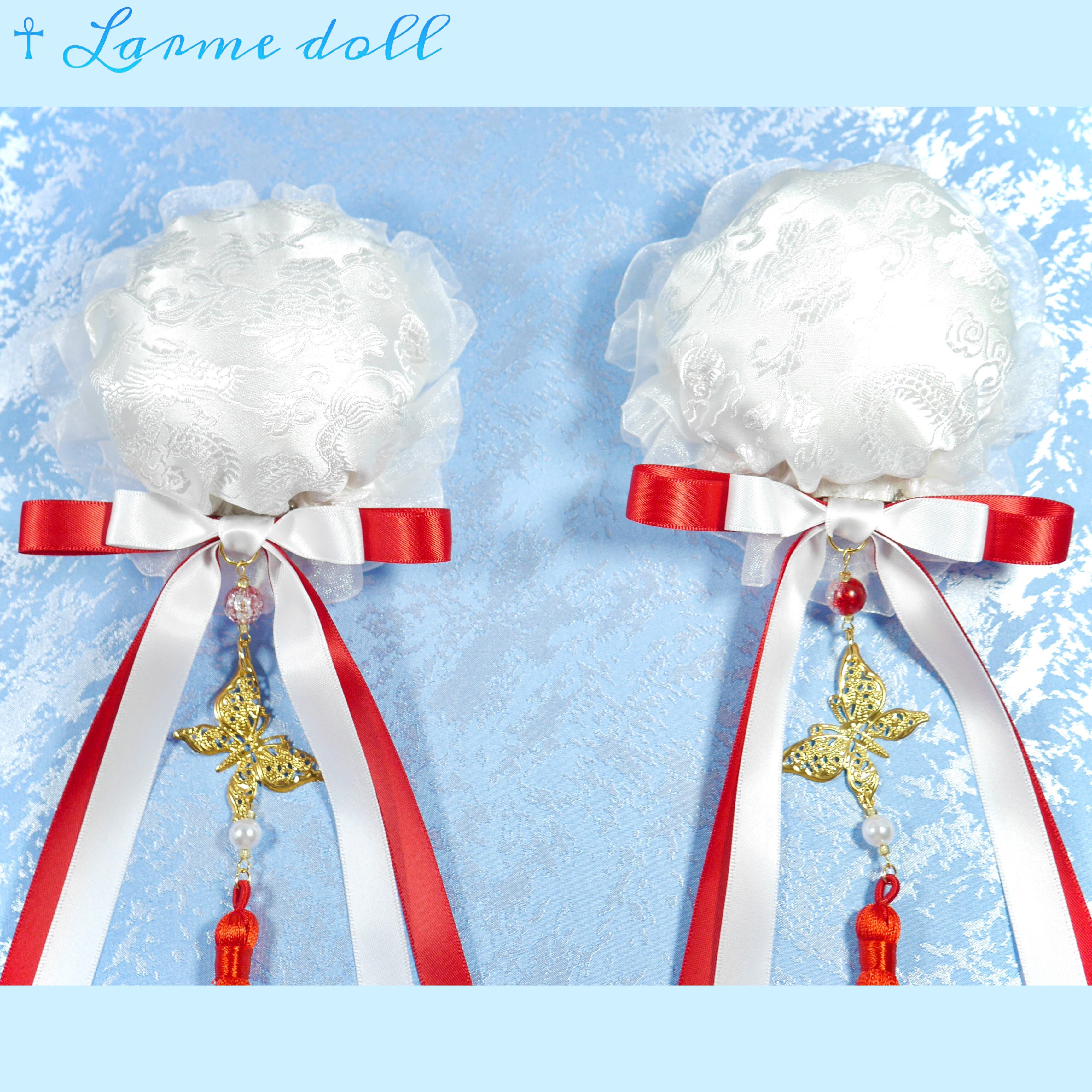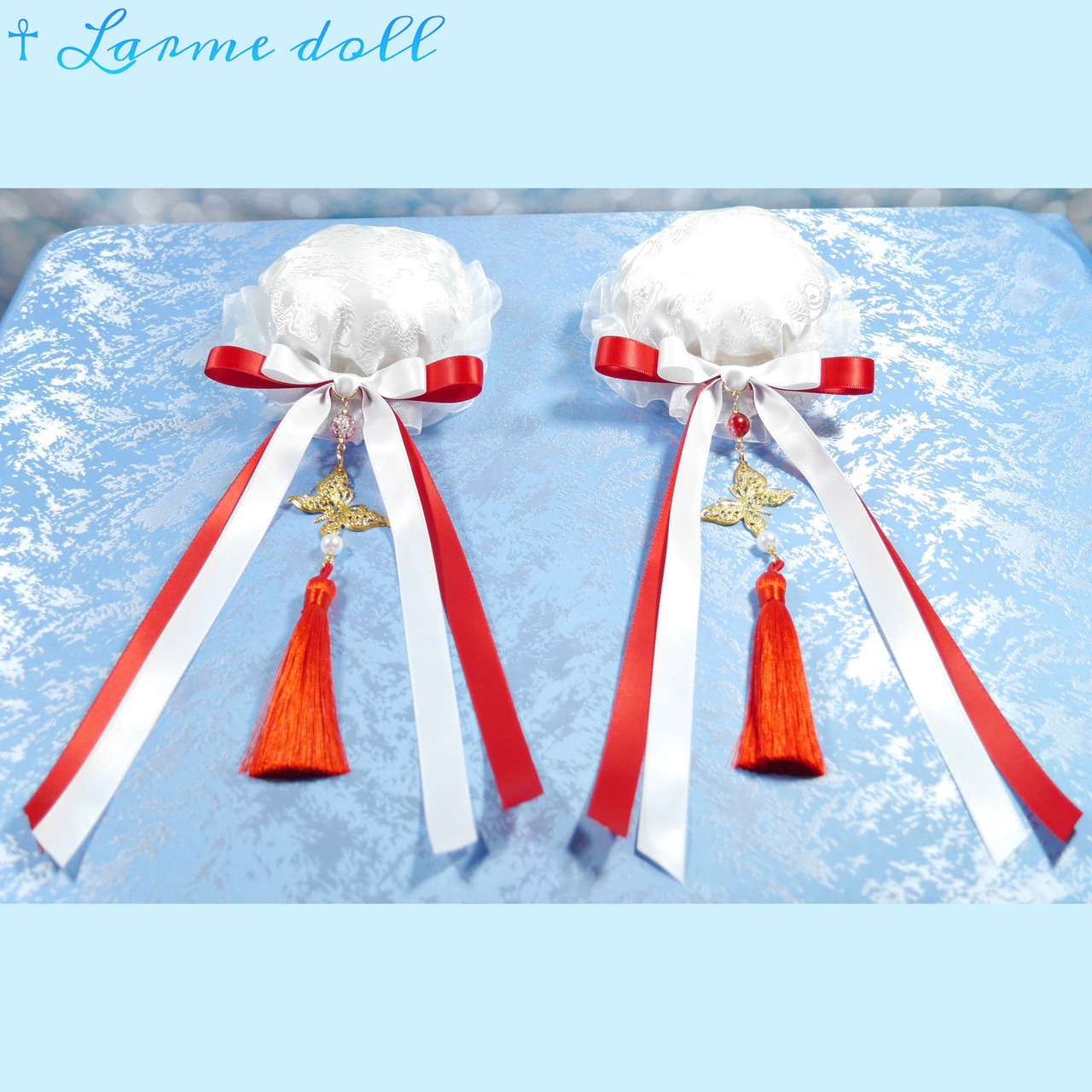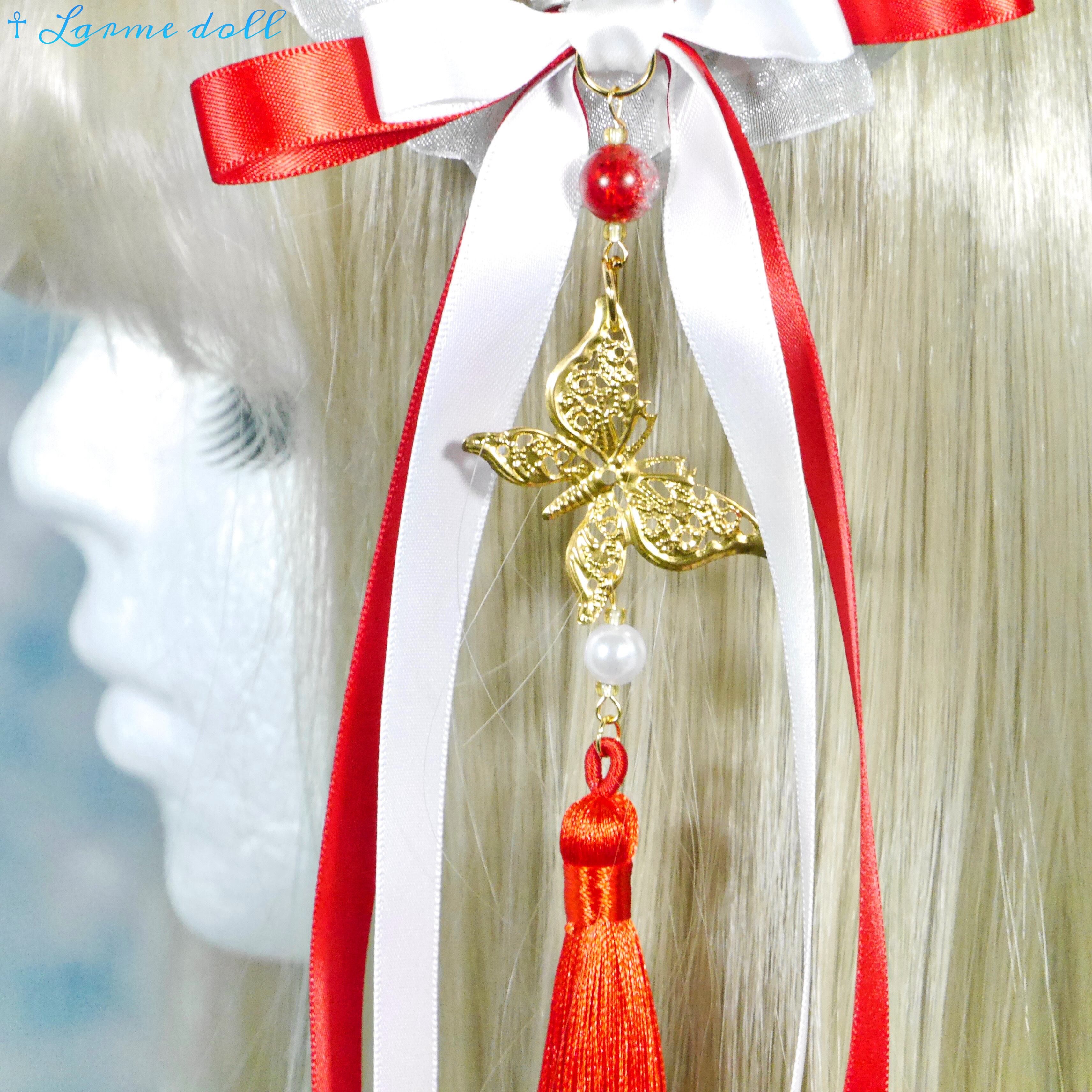 【受注生産】《☥》ダブルリボンタッセル付きお団子カバー カラー▷白×赤(接合パーツ、蝶チャームゴールドカラーver.)