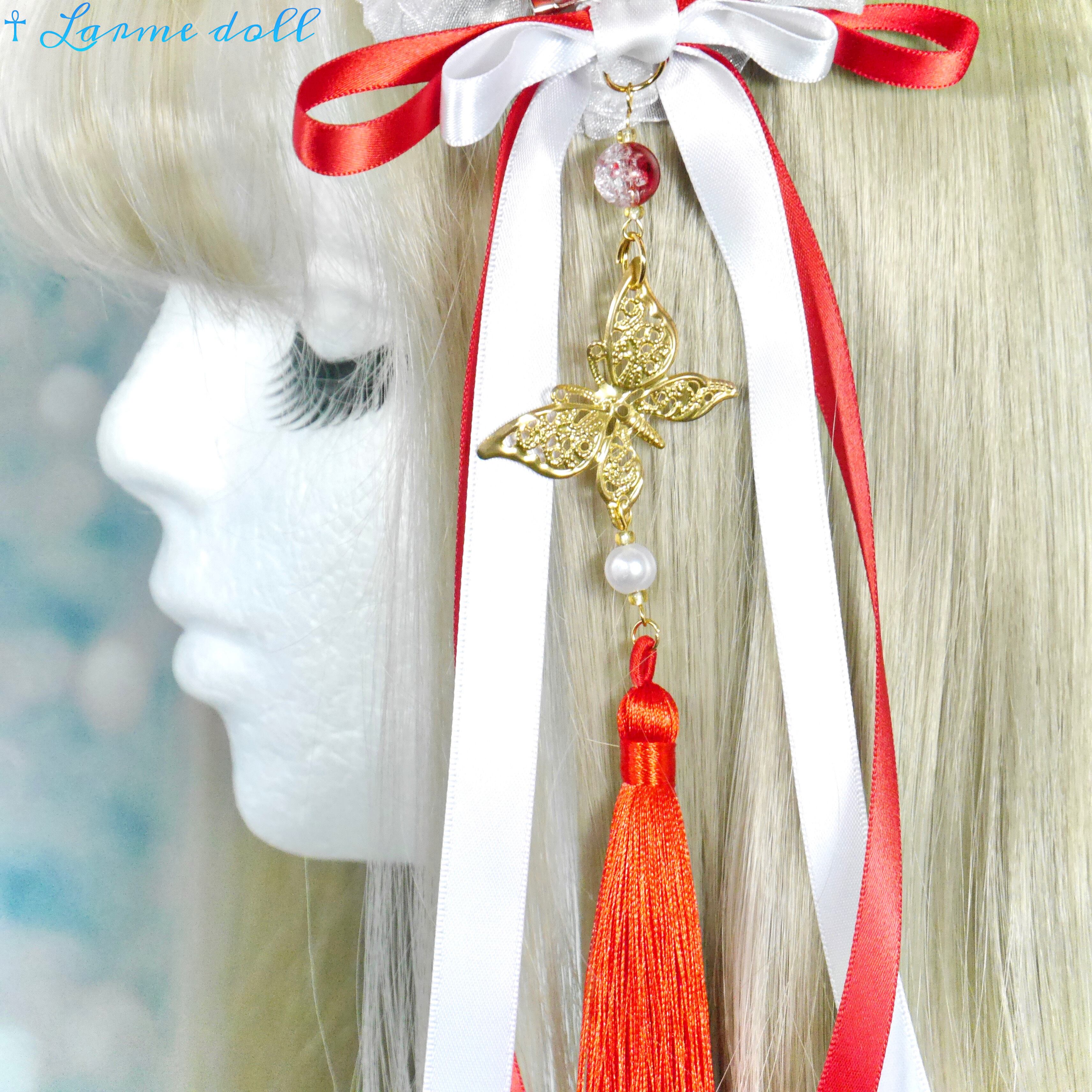 【受注生産】《☥》ダブルリボンタッセル付きお団子カバー カラー▷赤×白(接合パーツ、蝶チャームゴールドカラーver.)